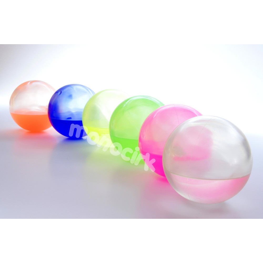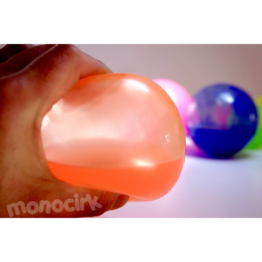 Balle de jonglerie souple transparente remplie au tiers de silicone liquide, matière très grasse plus lourde que l'huile.