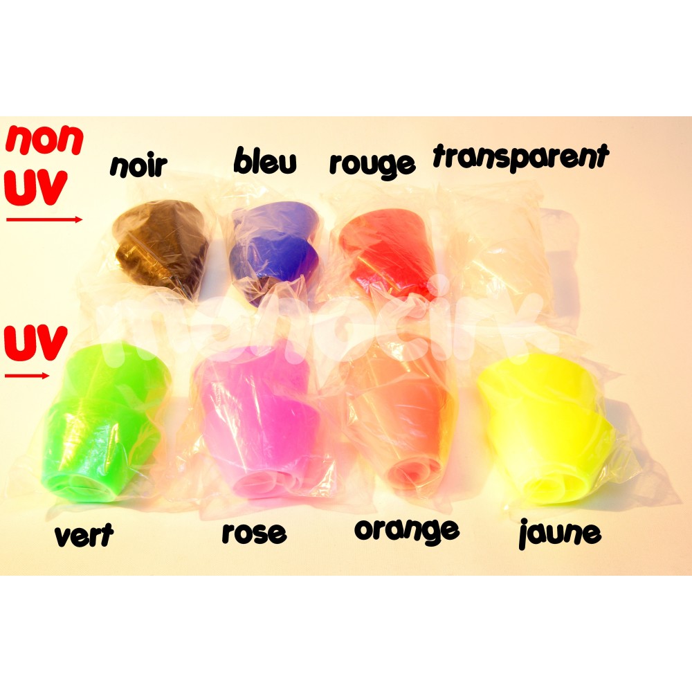 8 couleurs de kits silicone (voir les dernières photos) : 4 couleurs fluo (UV réactives) : vert, rose, orange, jaune, 4 couleurs non fluo : noir, bleu, rouge, transparent. Particularité du modèle silicone transparent ultra personnalisable : vous pouvez faire apparaître vos propres motifs, dessins, peintures, nom et prénom, tout ce qui vous passe par la tête. Pour fixer vos décorations sous le silicone transparent, le papier auto-collant c'est parfait, sinon c'est un peu galère, ça bouge un peu. Les marqueurs pour faire de jolis dessins, ça marque bien aussi mais attention, l'encre marquera le silicone.