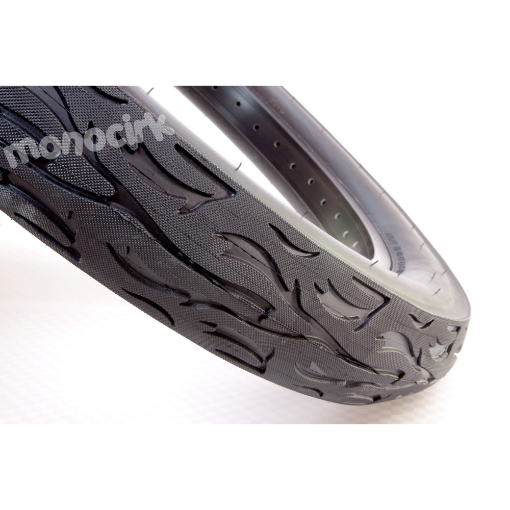Un pneu slick (lisse) ultra large et confortable, léger et très résistant avec un excellent contrôle. Ce large pneu et sa structure originale en forme de flammes se monte sur les vélos chopper et beach cruiser, il est impressionnant sur une jante 20" de monocycle pour la ville, la plage, le look et les super rebonds.