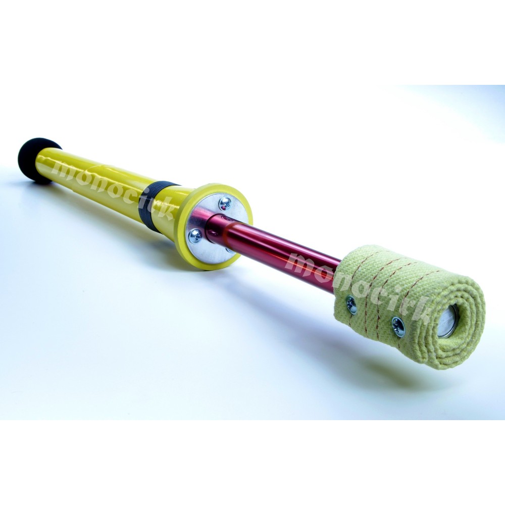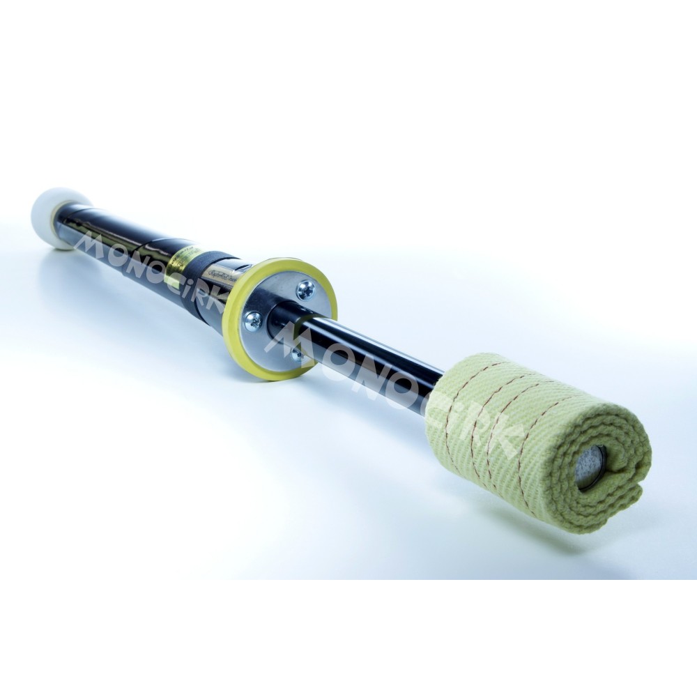 La tige interne qui traverse la poignée : particularité qui fait de cette torche la plus solide de toutes. Elle est composée d'un tube en aluminium creux enveloppé d'une épaisse couche de nylon haute résistance et de fibre de verre. Ce matériau composite rend la torche légèrement flexible pour absorber les chocs, il résiste au contact du pétrole, aux hautes températures et ne se déforme pas. À noter que les tiges internes en bois sont régulièrement les points faibles des torches chez les fabricants.