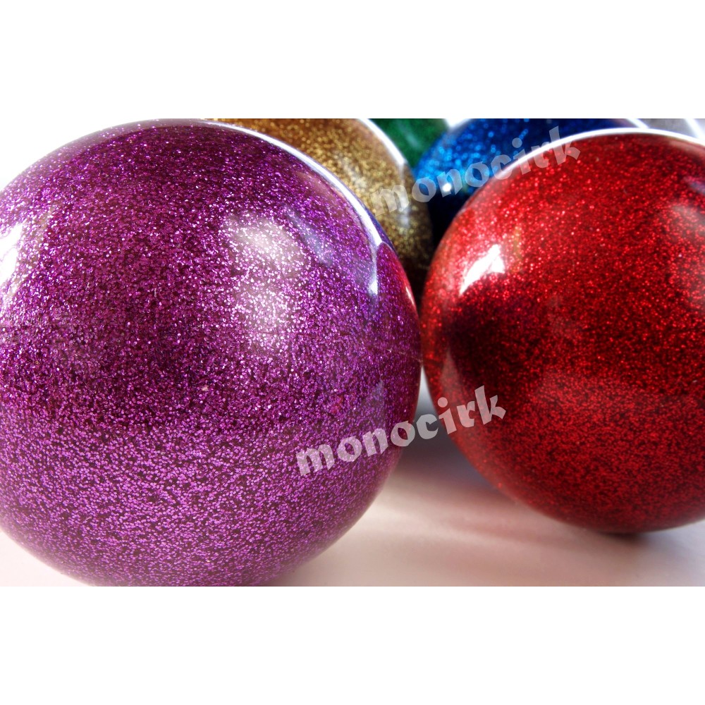 Balle assez dure, plus rigide que les balles scène PLAY et MISTER BABACHE. Les paillettes sont incrustées dans la masse, ce n'est pas une décoration de surface.
