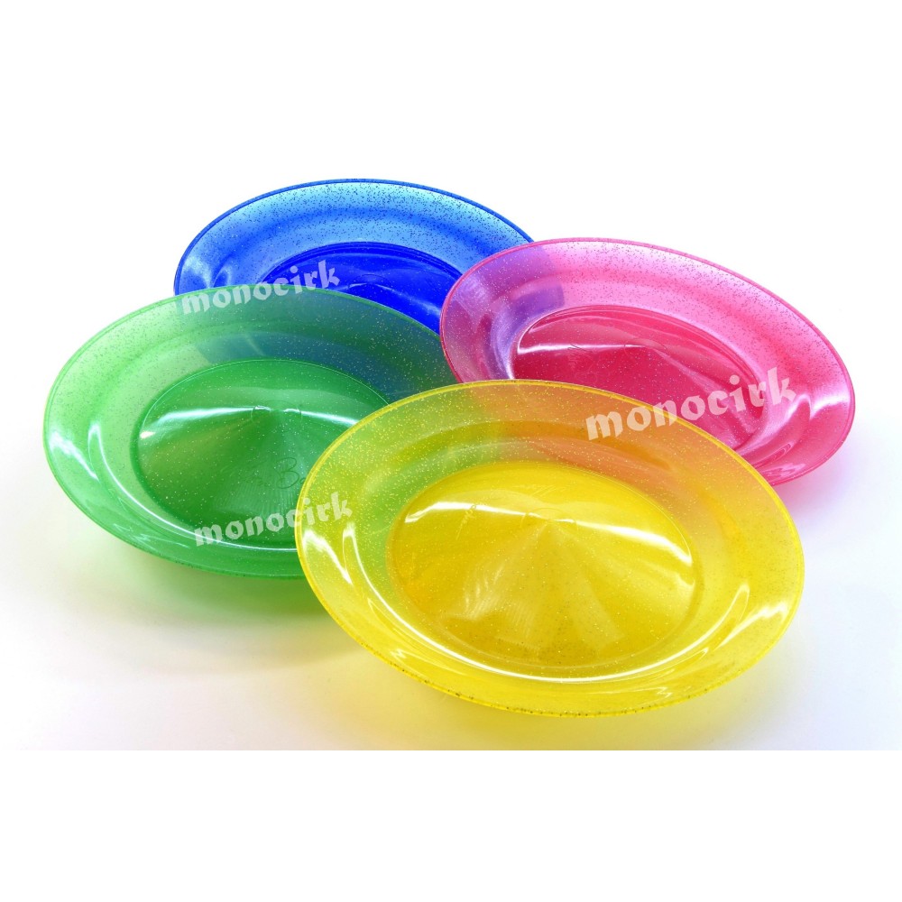 Une assiette proche du modèle souple italien de Play et aussi plus haut de gamme. La Glitter de Mister Babache est 10g plus lourde (elle tournera un peu plus longtemps), 1 demi centimètre plus large et aussi souple. Les assiettes souples se déforment facilement si l'on s'amuse à les tordre, ce modèle Babache retrouve sa forme plus facilement à comparer avec l'assiette de Play/juggle Dream.