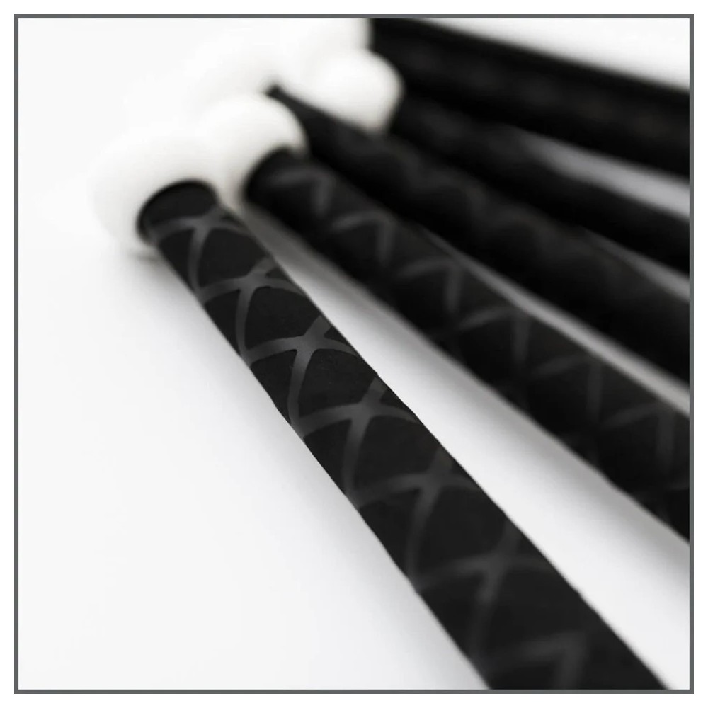 Impressions immédiates avec une Mephisto : belle, sobre et finition parfaite. Pas de vis apparentes entre le manche et le tube et le joint rond en silicone stoppera (un peu) les coulures de pétrole et protégera des chocs au sol, l'embout rond et blanc de protection est celui des massues PX3, il est en plastique.