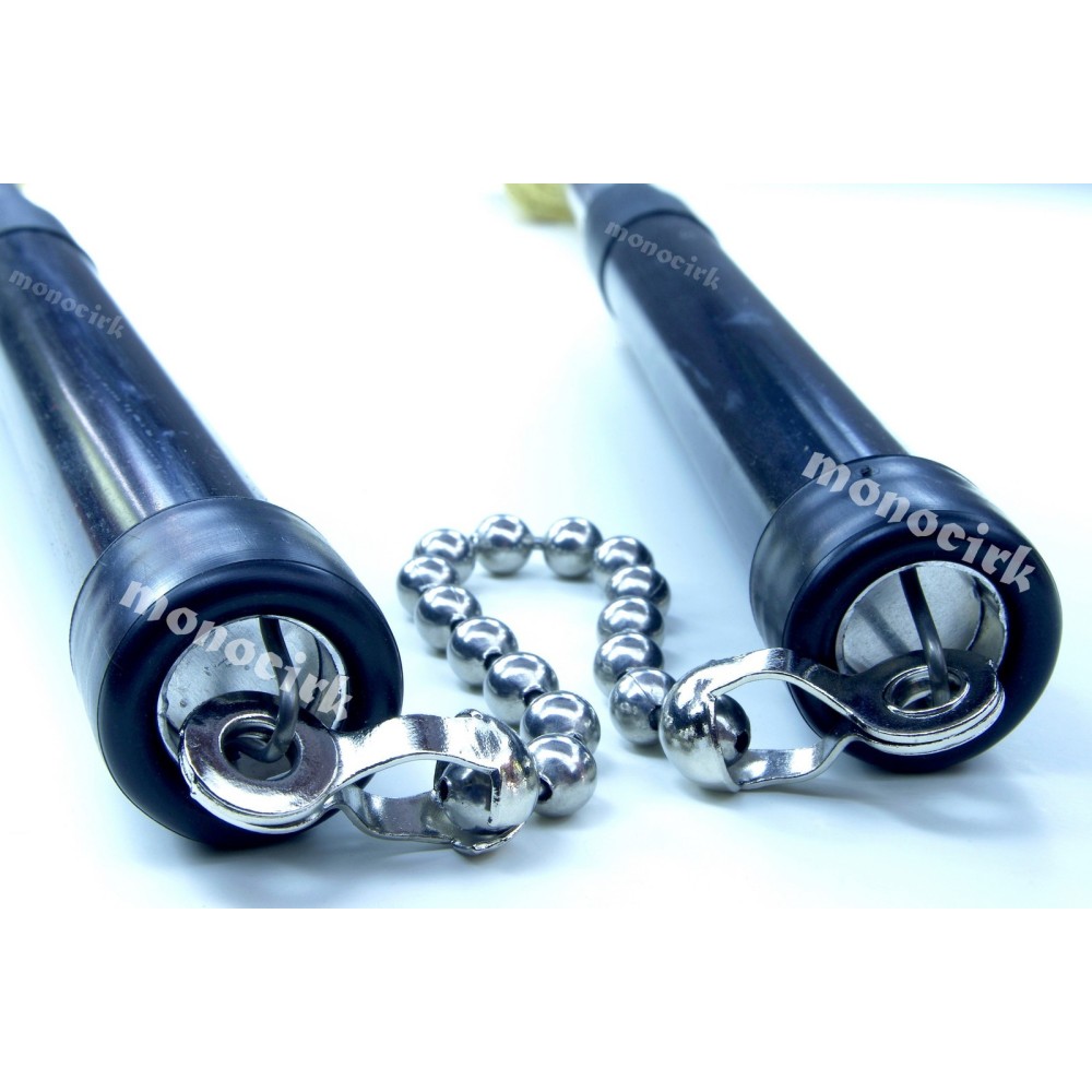 Fyrefli présente son nunchaku, on remarque la sobriété et la qualité de fabrication, la finition est soignée, Fyrefli a pensé aux rondelles sous les vis. Le modèle Fyrefli est plus long et plus lourd que le modèle Gora. Une gaine thermo-rétractable fait la liaison entre la poignée silicone et le tube en aluminium, le pétrole ne coulera pas dans les poignées. Plus de détails en description.