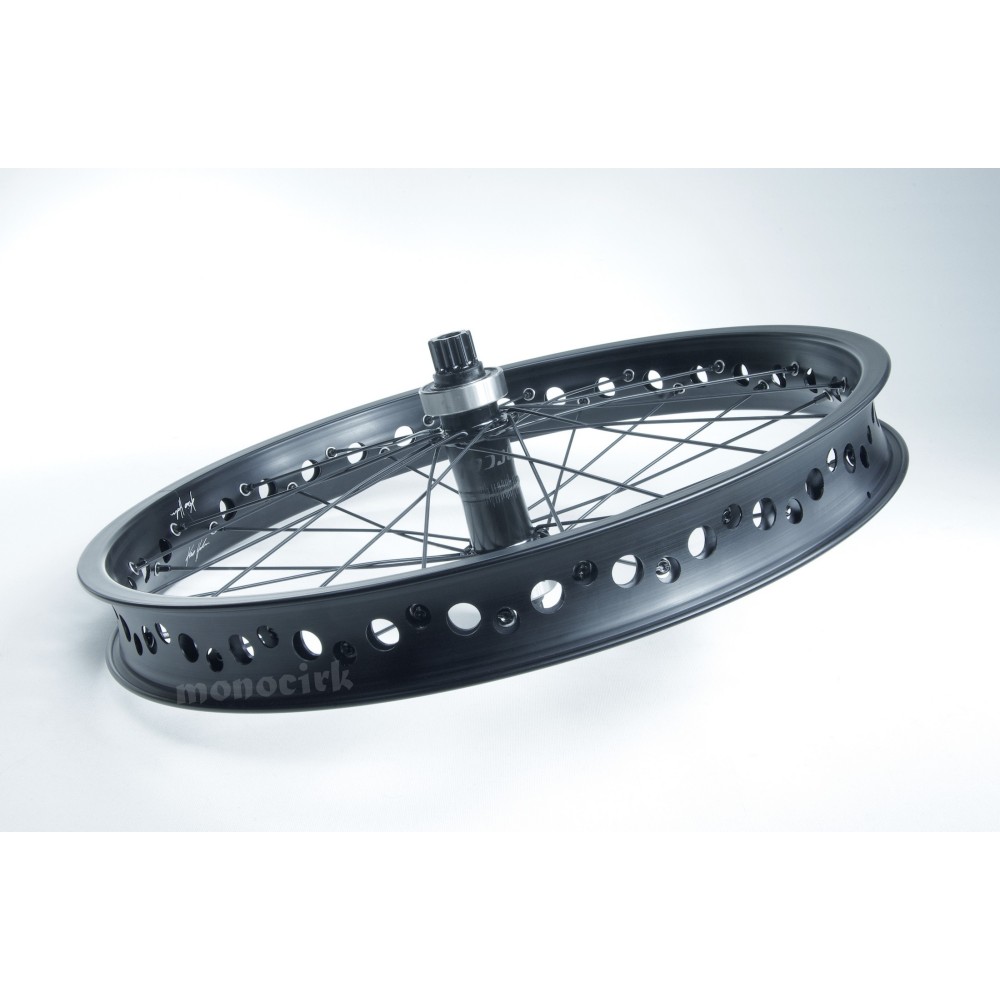 Roue vendue avec ses 2 vis M12 + 2 spacers + rondelles qui se placent entre les roulements et les manivelles et un fond de jante adapté : 19" x 40-41mm.