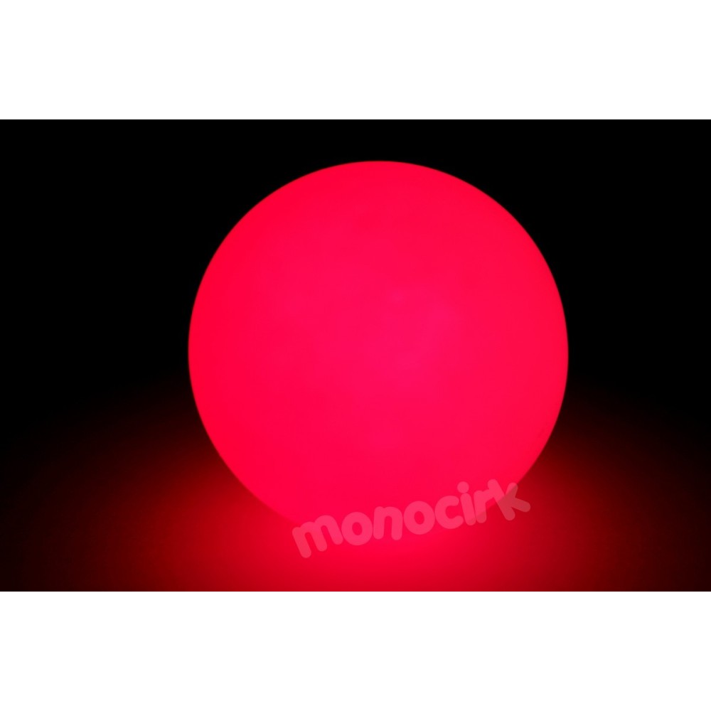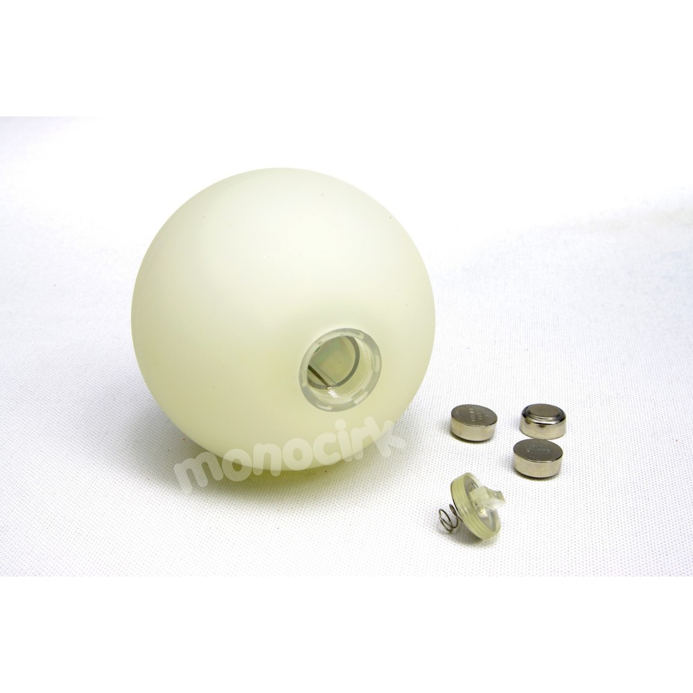 De qualité très correcte, elle est remplie de graines qui diffusent parfaitement et uniformément la lumière sur toute la surface. Dans l'obscurité, l'effet est réussi. Les LED sont protégées dans la masse de la balle, l'enveloppe est très solide, opaque, facilement lavable, assez souple et très agréable, le toucher est légèrement pêche. Même sans piles, ces balles sont intéressantes et très confortables (143gr sans les piles).