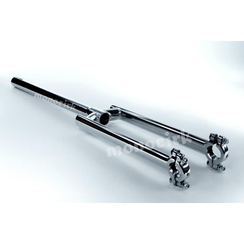 Une fourche de monocycle en acier, solide et assez lourde pour le freestyle, les sports en salle, les balades sur route et même le tout terrain puisqu'il est possible de monter un pneu large en 2,6".