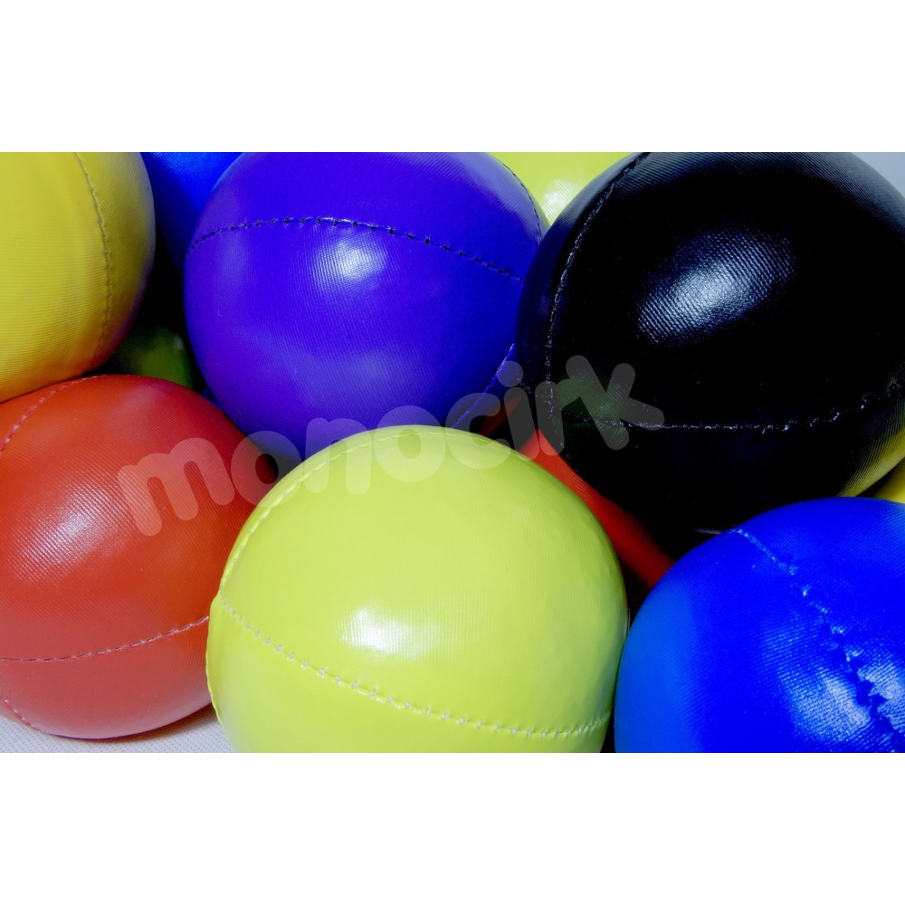 Balle de jonglerie à grains très molle pour enfants et adulte, coutures et revêtements solides. Nombre de rebonds lâchée à 2,5m de haut sur sol carrelé : 1 (balle "sac" = 0 rebond). Roule très peu au sol.