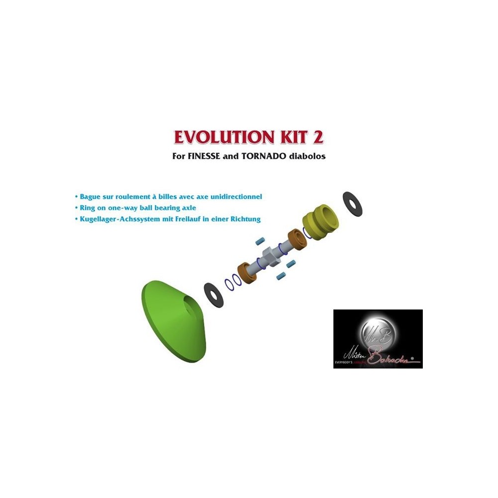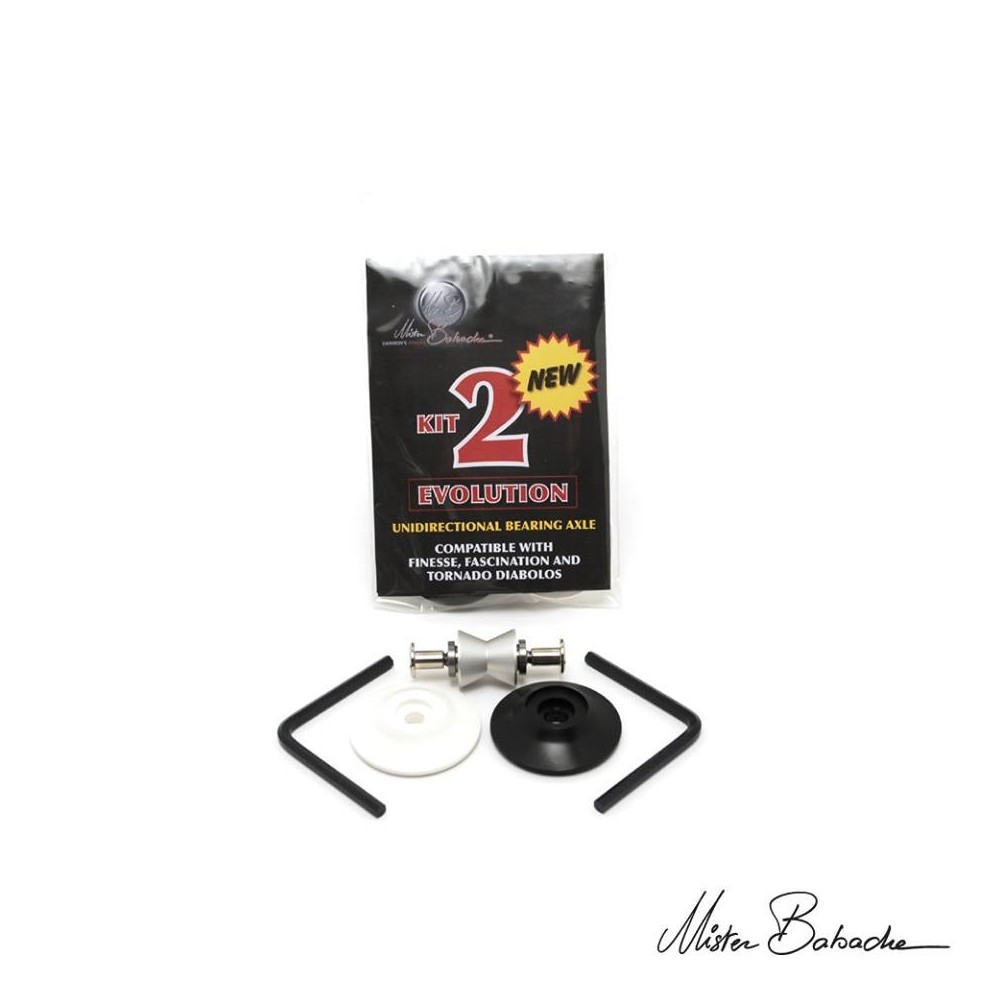 Le Kit EVOLUTION n°2 comprend : 1 axe à roulements + 2 cônes repère (1 blanc + 1 noir) + 2 clés allen n°5 longues pour un serrage sans toucher les coques du diabolo (très pratique, voir dernières images).