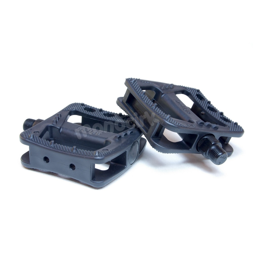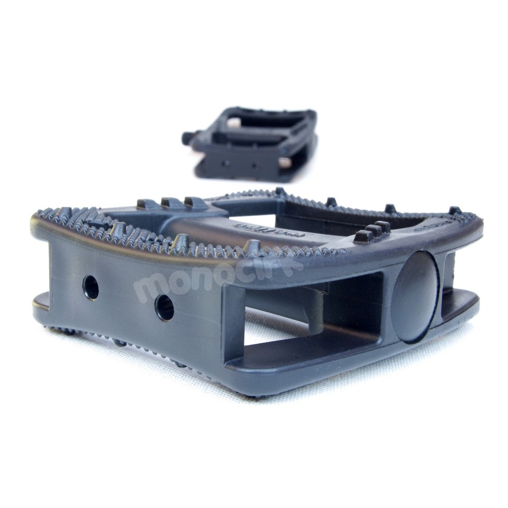 Des pédales légères en plastique à picots moulés avec une accroche excellente. Un peu fragiles pour le flat et à éviter en street et en trial bien sûr. En cross "tranquille", ces pédales se comportent très bien avec l'avantage d'être légères.
