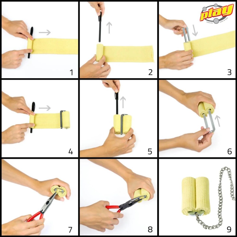 La mèche en kevlar a une durée de vie assez longue. Son remplacement sans vis est simple, rapide, il suffit de rouler la mèche dans un sens puis dans l'autre. Il faut 50cm de kevlar pour chaque tête, 1M en tout pour la paire de bolas. Le schéma de PLAY propose un outil (crayon) pour rouler la mèche autour ce qui crée un espace trop important au centre, je vous conseille de rouler la mèche sans outil afin de réduire cet espace, il faudra forcer légèrement la mèche roulée dans la platine en forme de U ce qui maintiendra l'ensemble correctement. Quelques conseils et remarques en description. Le prix est pour la paire modèle sangles nylon (photo 1). Sans le sac de la photo 3 officielle de PLAY