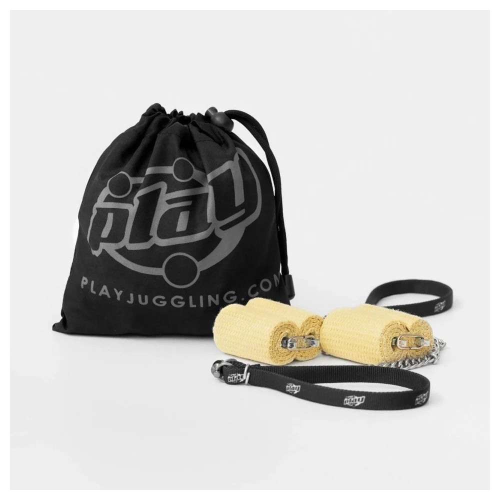 Une petite paire de bolas toute simple et très efficace avec un système de remplacement de mèche sans outil, rapide et ultra simple. La poignée en nylon est solide mais basique, ce qui explique aussi le prix peu élevé de cette paire de bolas. Il est facile de trouver tous types de poignées dans le commerce si vous décidez d'en changer ou d'adapter une paire de poignées boules en silicone pour un confort maxi. Un petit mot à propos des poignées rondes qui remplacent régulièrement les sangles sur les poïs et bolas : c'est génial, vous pouvez lâcher, lancer, changer de main. Notez que certains jongleurs sont fidèles aux sangles.