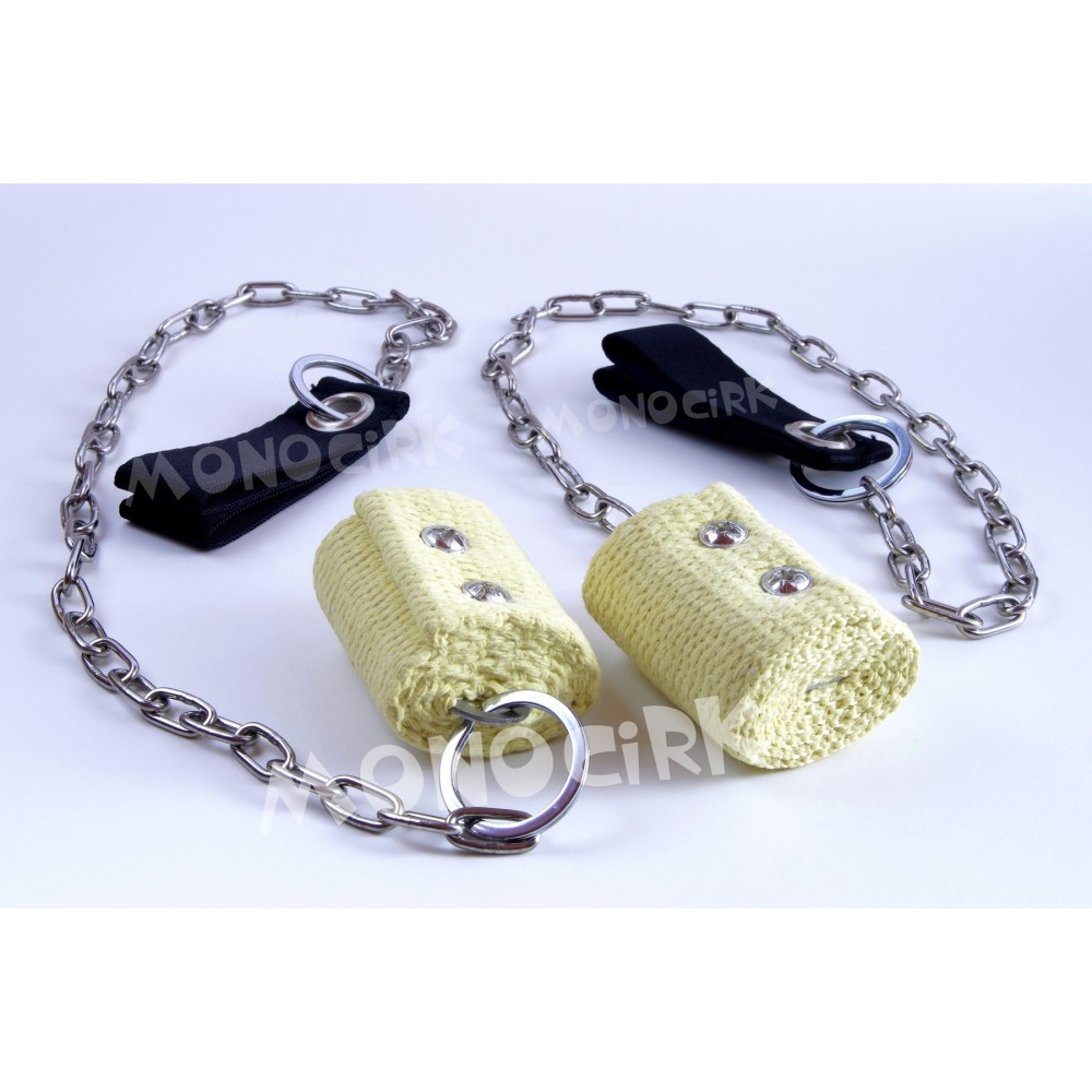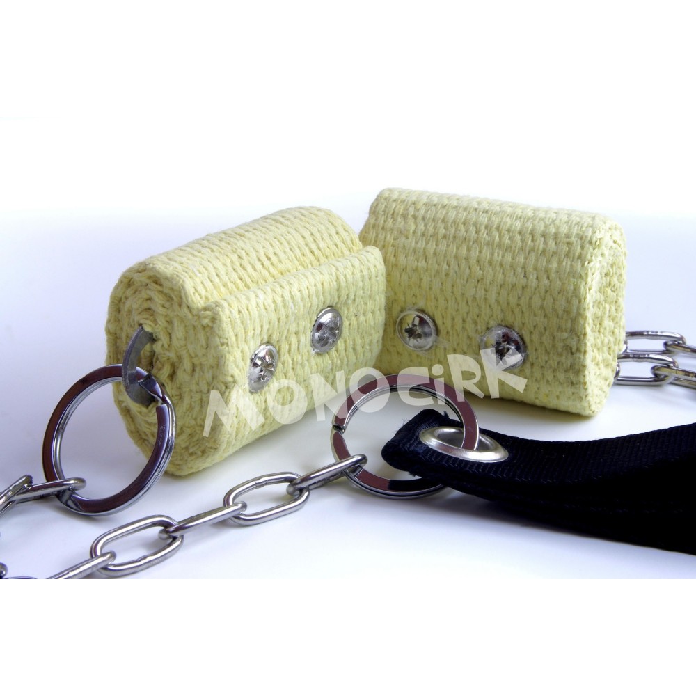 Différences avec une paire de bolas plus évoluée : maillons de chaînes assez simples, pas d'émérillon tournant entre la chaîne et la poignée, système de fixation des mèches simple par 4 vis.