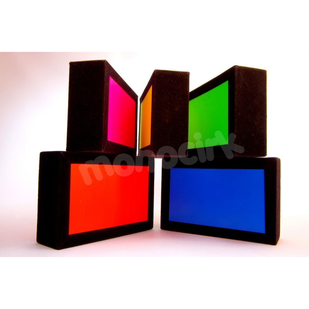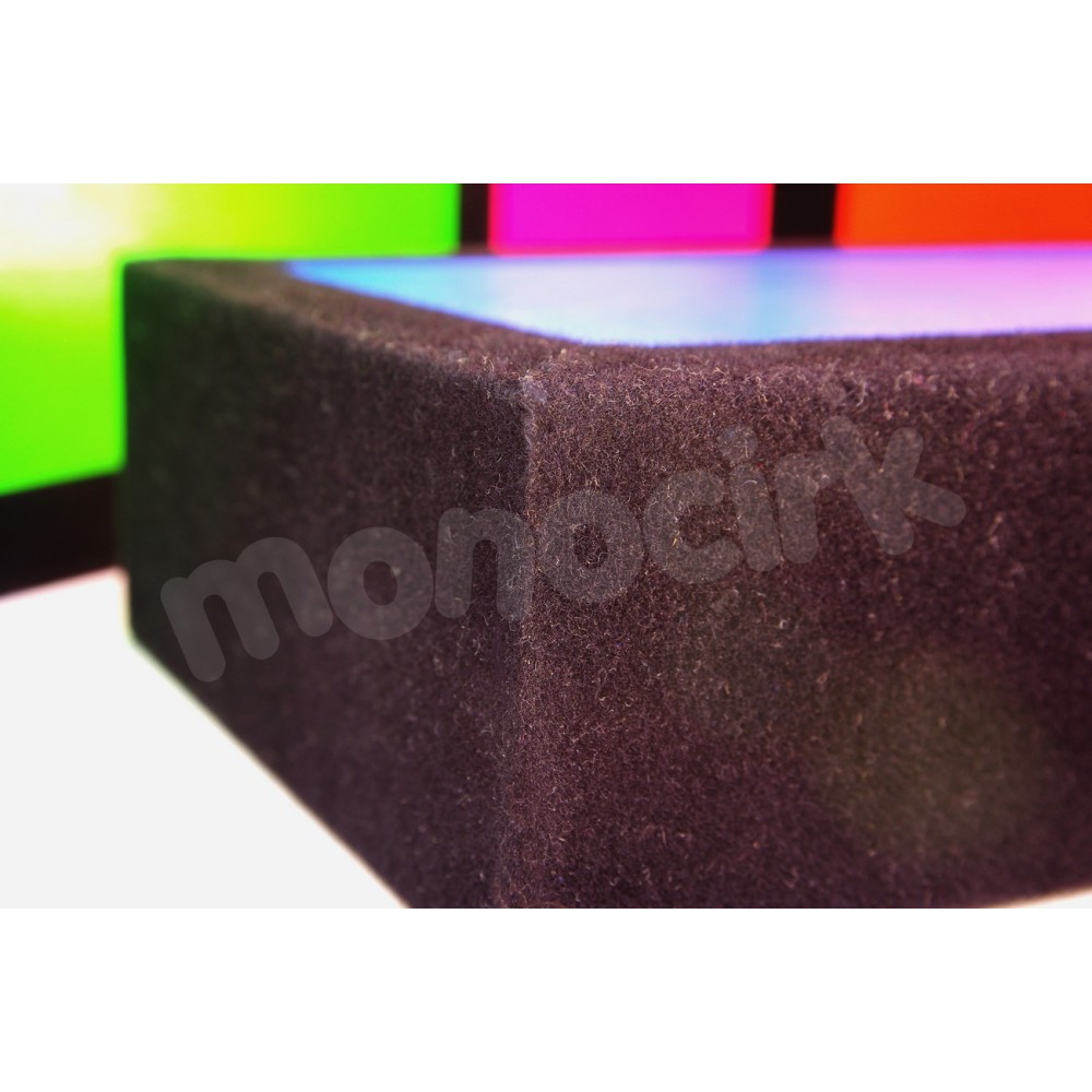 Les larges protections en feutre noir entourent les quatre côtés de la boîte (photo 3), la bande agit comme un grip pour assurer les blocages entre les boîtes quelque soit les côtés utilisés. Cette même bande recouvre aussi tous les angles qu'il est nécessaire de protéger des impacts entre les boîtes et au sol. Les deux faces sont en adhésif FLUO. À noter que trouver du bleu fluo n'est pas courant. Pour visualiser les effets fluo à la lumière noire, voir la photo 2. On remarque que, très souvent, éclairés à la lumière noire, le jaune et le vert se confondent en VERT, le rose et le orange sont proches.
