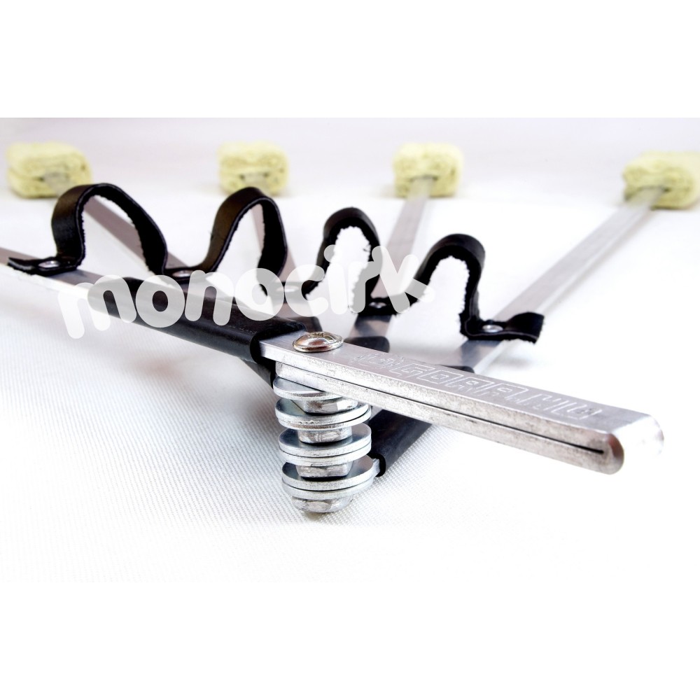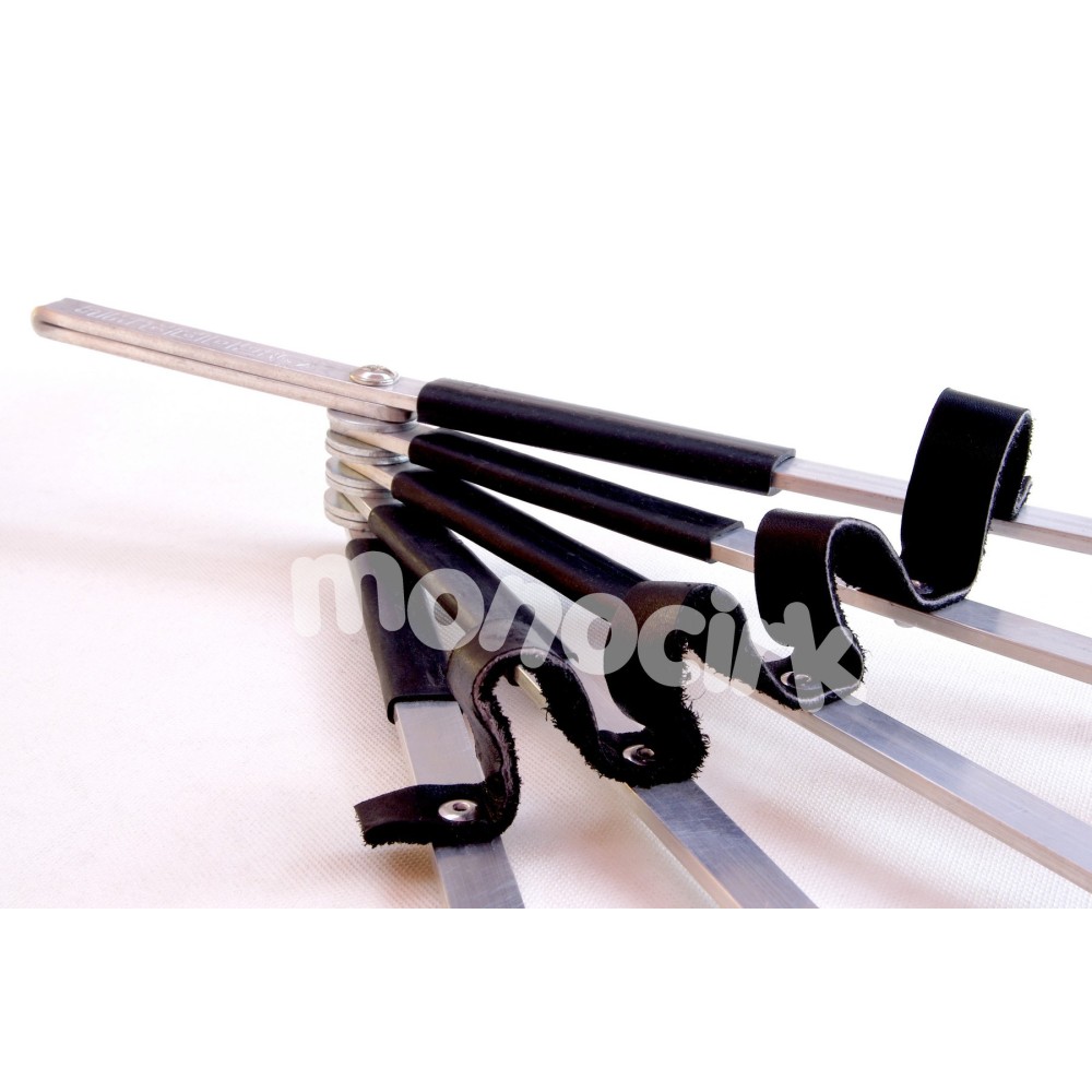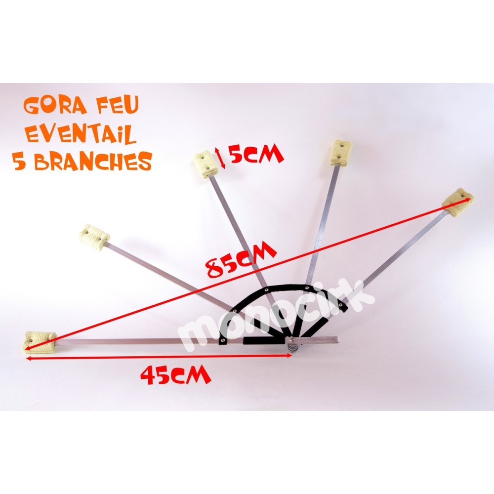 Très bien étudié, l'éventail est équipé de 5 banches rectangulaires en aluminium maintenues sur un même axe et libres de se déployer et se replier. La bande noire en demi cercle qui relie les 5 branches est en cuir, les 5 mèches ensemble donneront de très belles flammes pendant moins de 10 minutes. À noter que Gora aime bien les rivets pop (ou rivets aveugles) qui fixent très solidement sur les branches à la fois la bande en cuir et les mèches en kevlar. Changer les mèches est assez simple, il faudra faire "sauter" les rivets avec une perceuse, fixer les nouvelles mèches avec une pince à rivets ou changer pour des vis avec écrous.